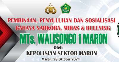 MTs. Walisongo 1 Maron melaksanakan Kegiatan Penyuluhan dan Sosialisasi Bahaya Narkoba, Minuman Keras (Miras), dan Bullying Tahun 2024 sebagai upaya pencegahan serta pembinaan karakter peserta didik. Kegiatan ini bertujuan untuk meningkatkan pemahaman siswa mengenai dampak negatif perilaku menyimpang terhadap kesehatan, psikologis, dan masa depan generasi muda.